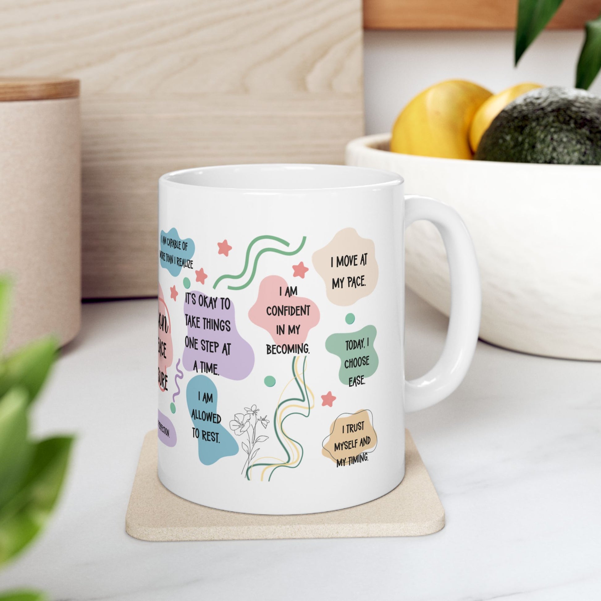 Crafted from durable white ceramic with vivid, long-lasting print, it’s microwave and dishwasher safe, BPA and lead-free—making it a thoughtful self-care gift for women, teachers, caregivers, or anyone choosing ease over overwhelm.