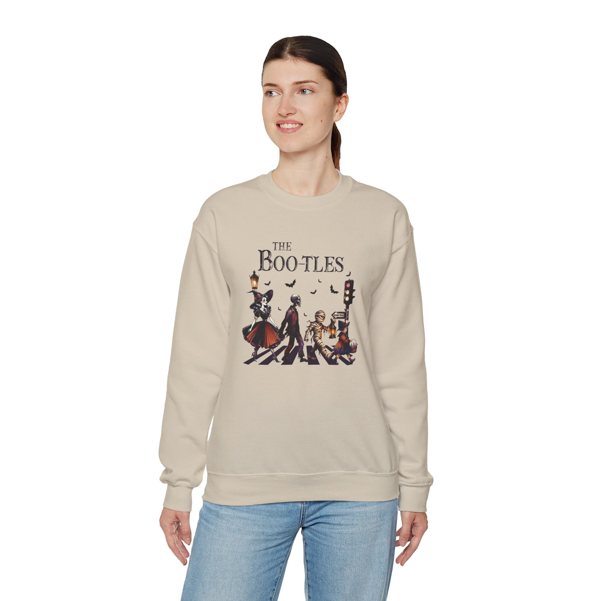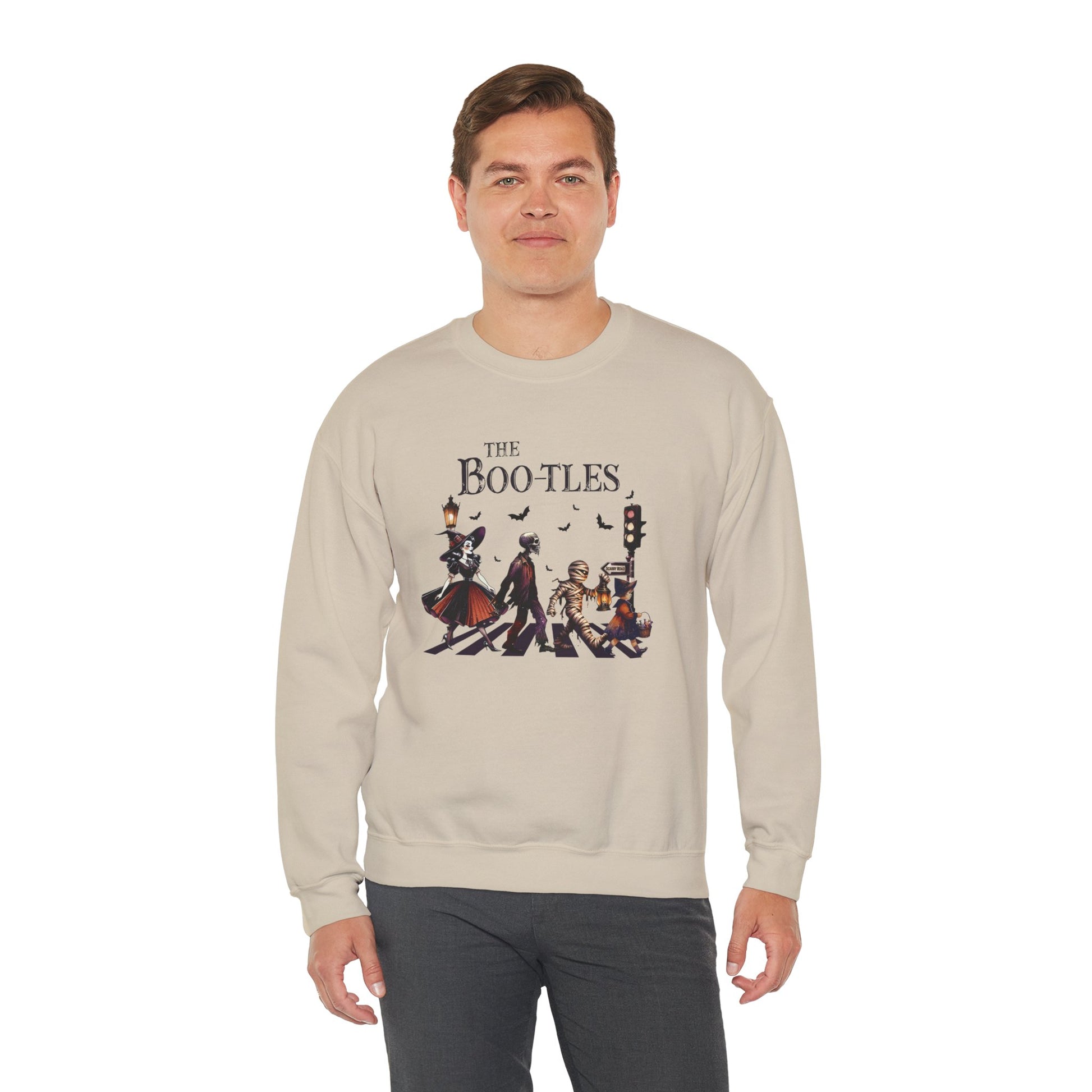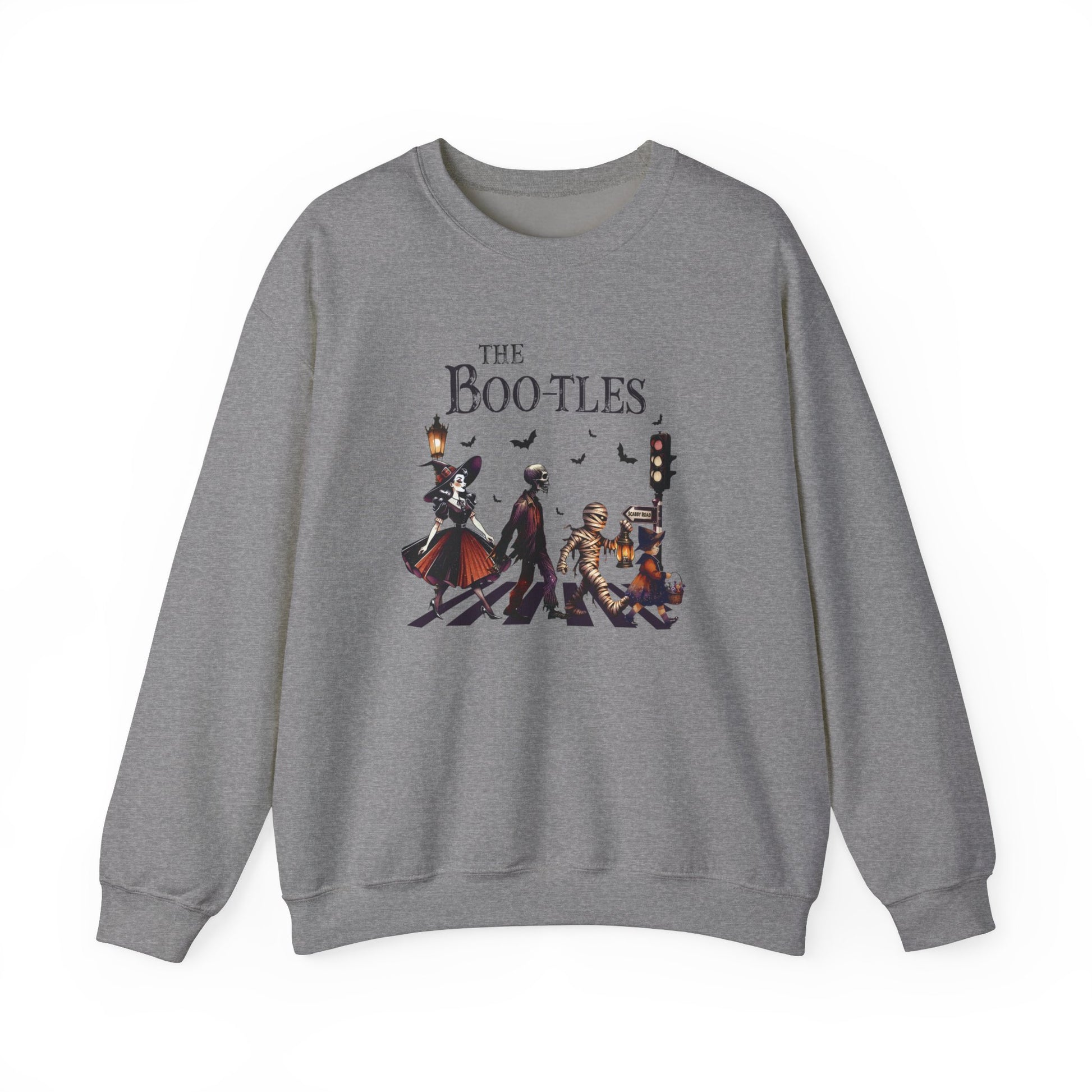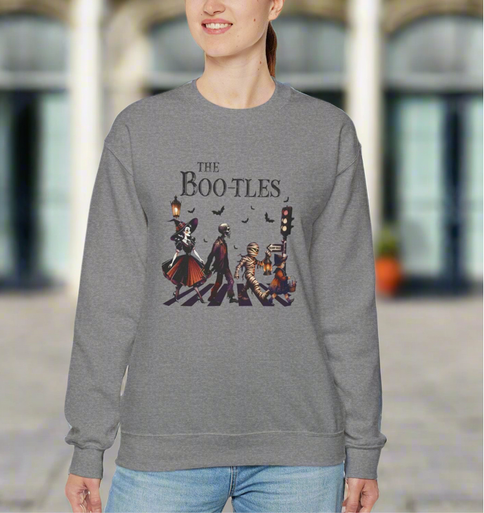 Step up your Halloween game with our spook-tacular Boo-tles sweatshirt! Get into the Halloween spirit with this fun and festive sweatshirt featuring skeletons, mummies, and witches crossing the street in style. Stand out at any Halloween party or event with this unique eye-catching design that is sure to turn heads.