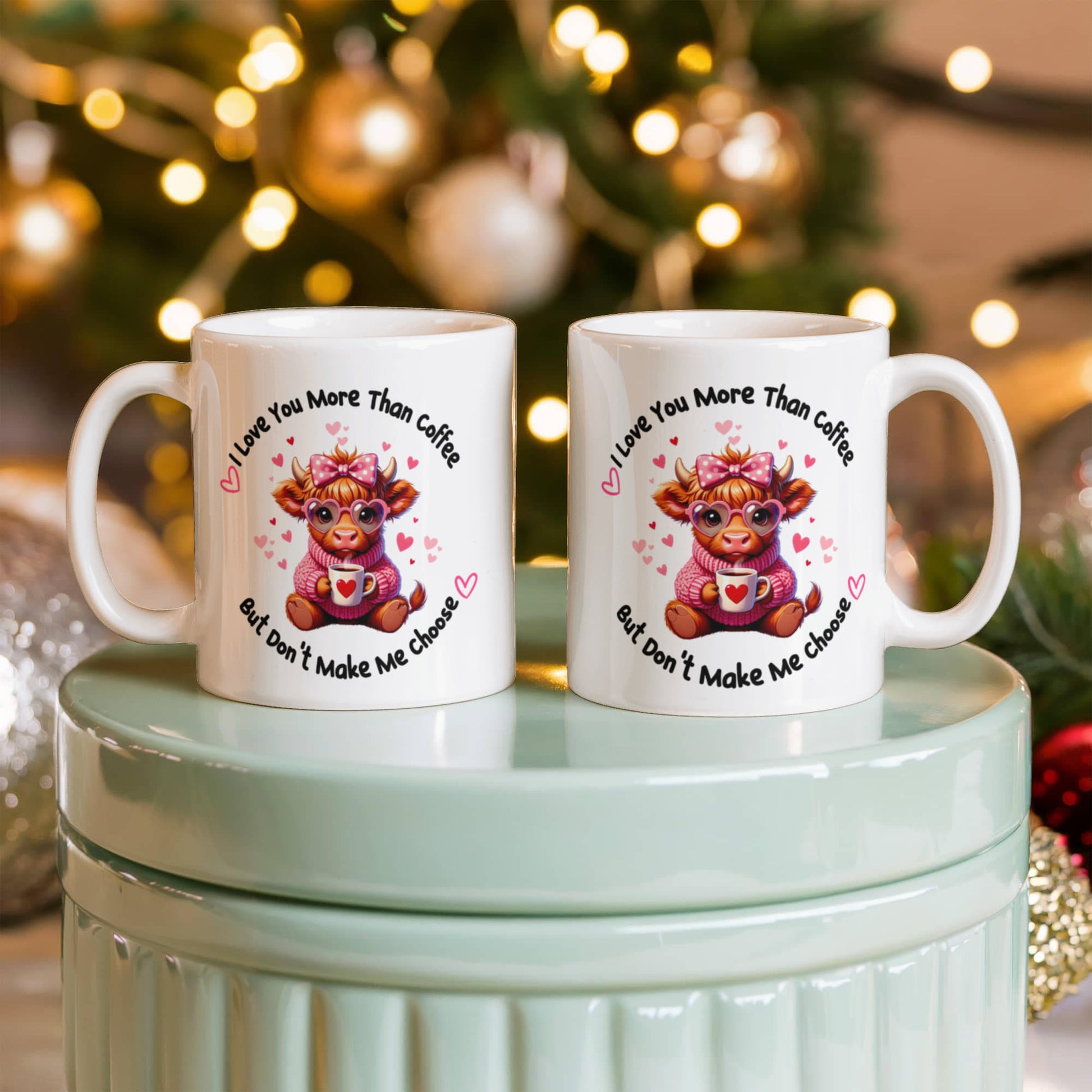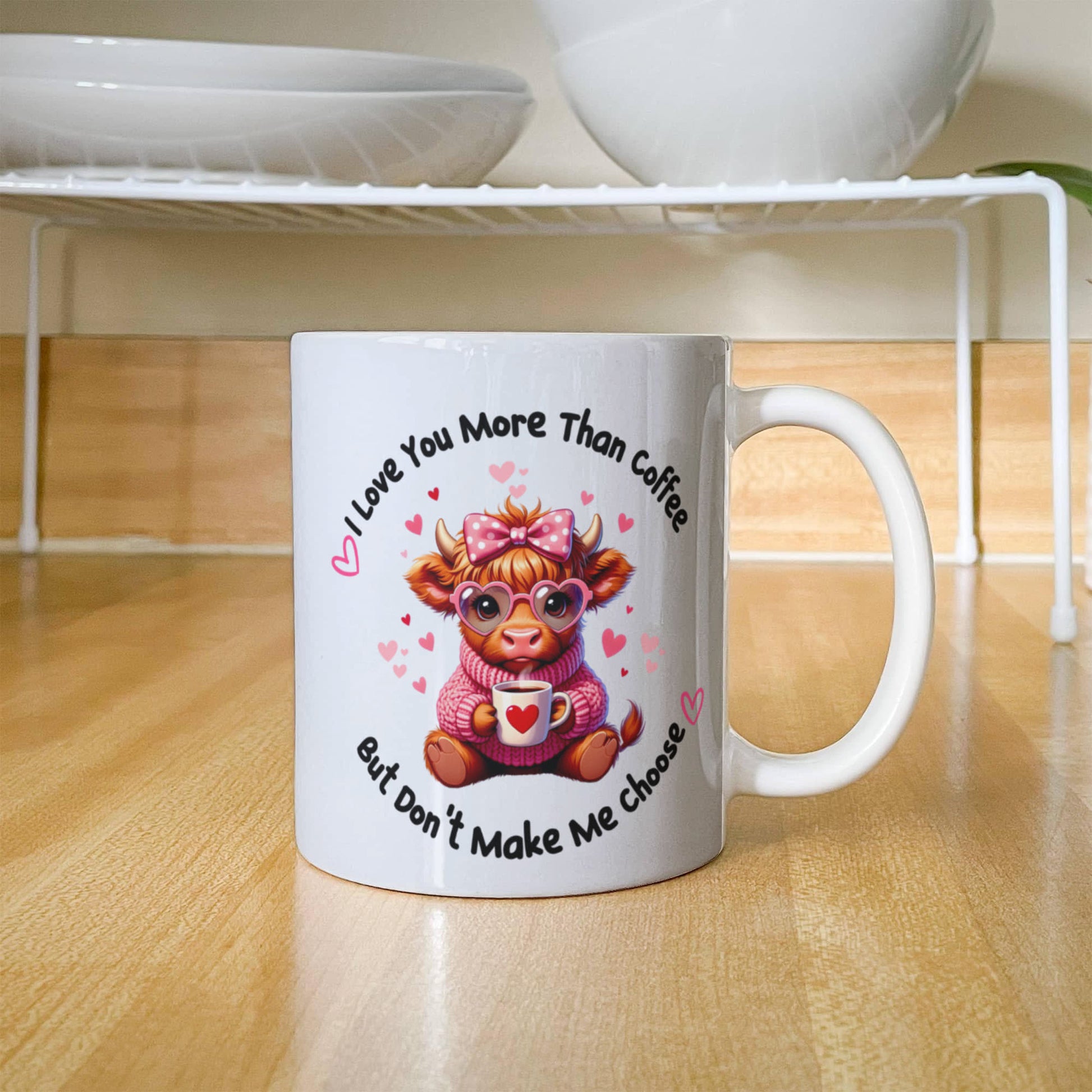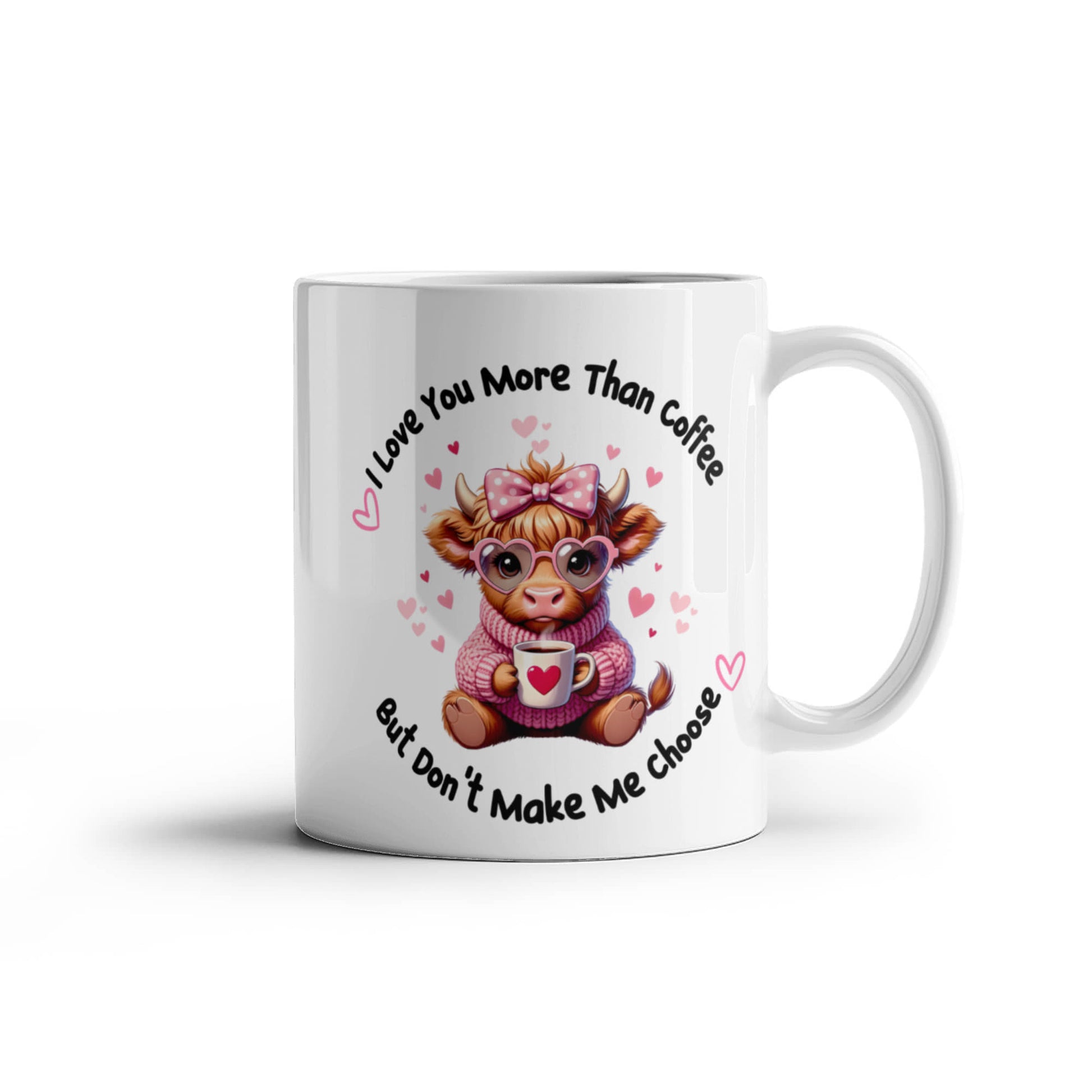 Elevate your coffee experience with our custom-made ceramic mug, crafted to reflect your unique style. Featuring an adorable highland cow design with the playful message "I Love You More Than Coffee, But Don't Make Me Choose," this high-quality mug is the perfect balance of elegance, durability, and functionality.