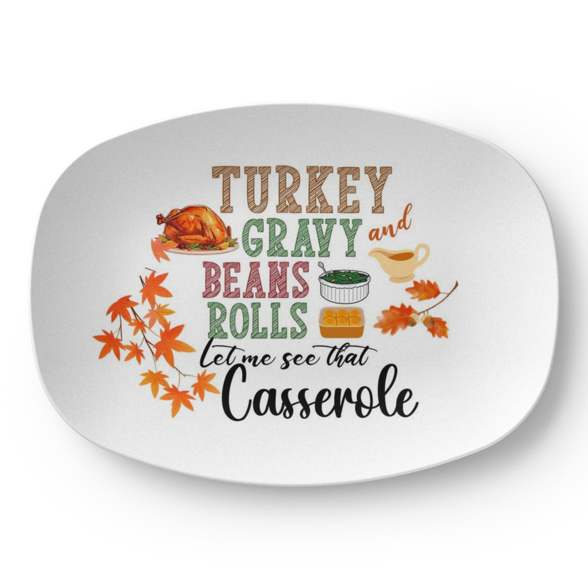 Make a statement at your holiday table with our 10" x 14" Thanksgiving serving platter, featuring a charming "Turkey Gravy and Beans Rolls - Let Me See That Casserole" design with festive autumn leaves. Crafted just for you in the USA, this versatile and family-friendly platter is perfect for serving appetizers, main courses, and desserts. Microwave and dishwasher safe for easy care, it's ideal for both indoor dining and outdoor gatherings. This durable, food-safe platter contains no melamine or BPA and makes a thoughtful gift for Thanksgiving, Friendsgiving, or any fall celebration, ensuring every gathering is memorable.