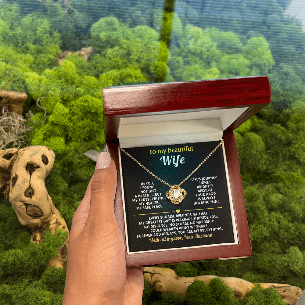 Premium Love Knot Necklace for Wife - 14K Gold Plated Anniversary Gift with CZ Crystals - Romantic Jewelry for Women-White Text